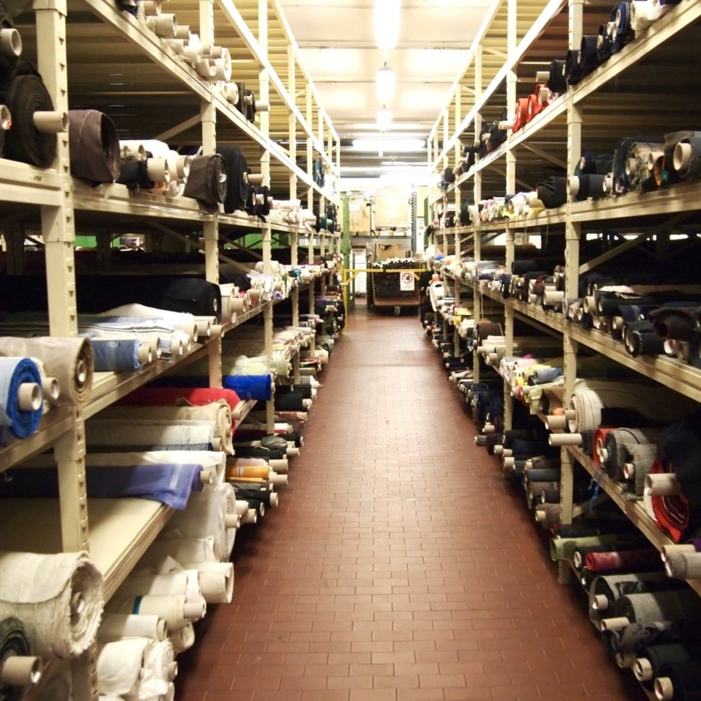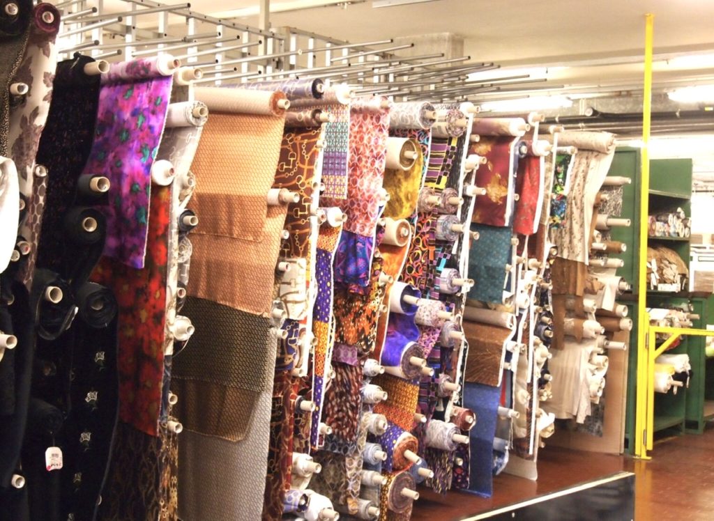 大きな体育館を何個も重ねたような広さのストックルームから、ブリジャンの感性に合う生地を探してまわります。