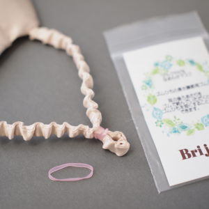 ブリジャンのシルク100% なめらかマスクは、ぴったりの長さのゴム紐を、伸縮させずに着用するのが理想的。