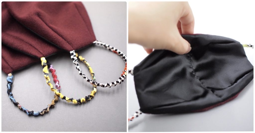 ボルドーの無地のマスクは、ブリジャンのマスクの特徴であるシルクで包まれたゴム紐が、3種類の柄の中からお選びいただけます。