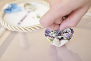 枠に張られたオーガンジーの上に、針を使ってシルクの花びらやビジューを刺して完成させます。