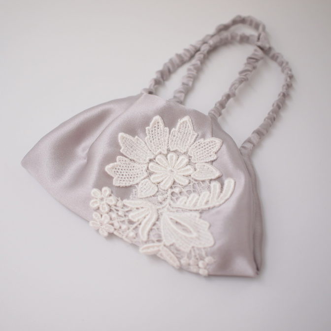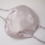 シルバーのシルク100%のサテンの上に、イタリア製のレースを重ねてお作りした、高級感あふれる美しいマスクです。